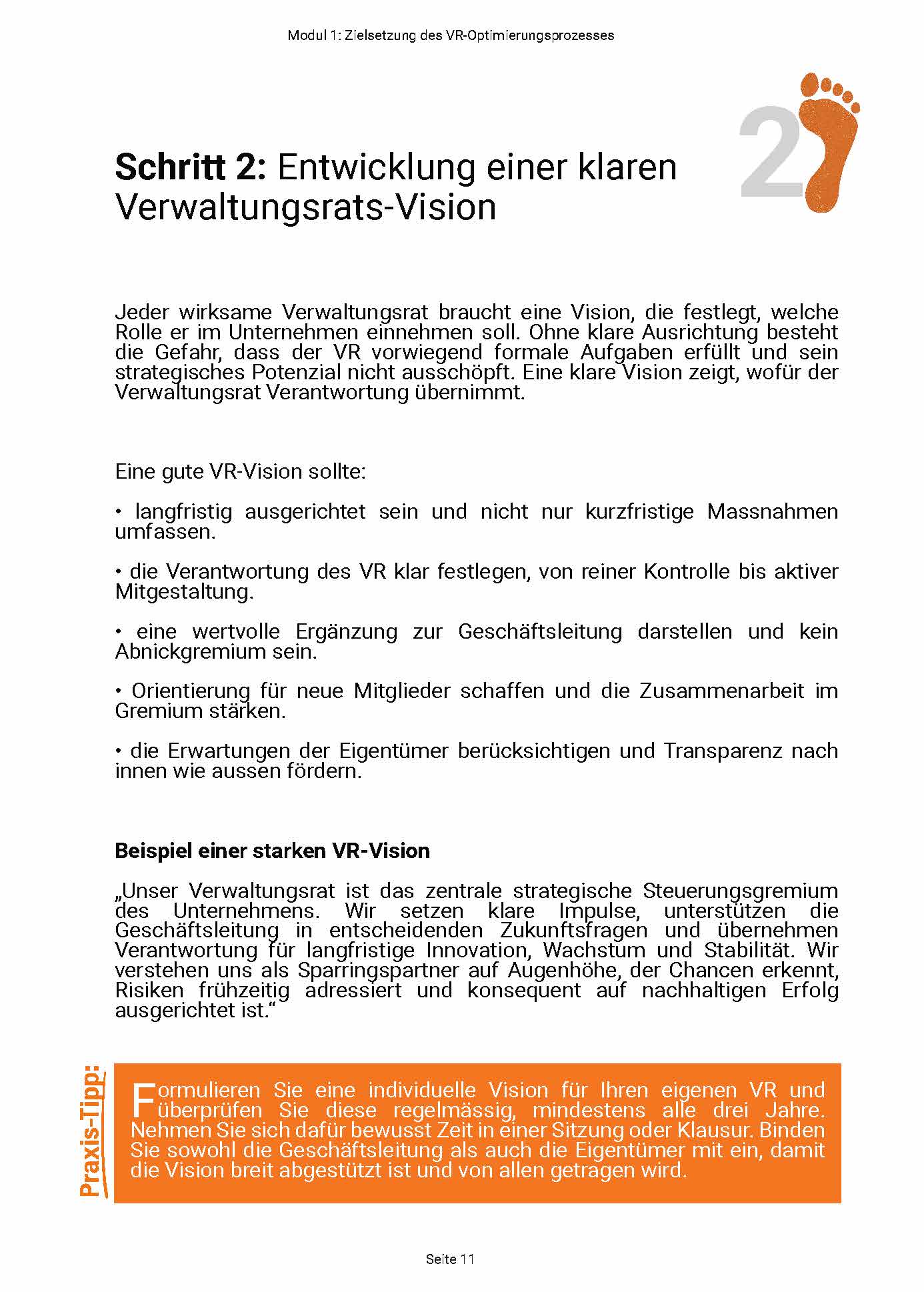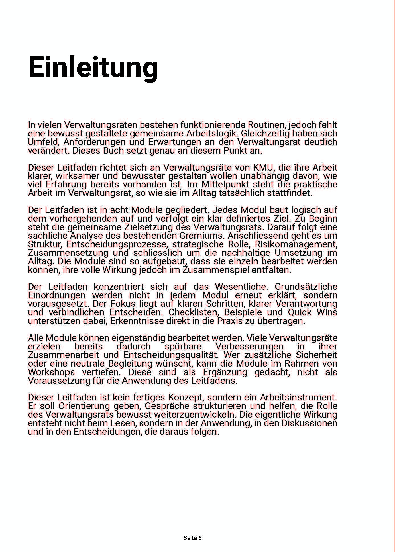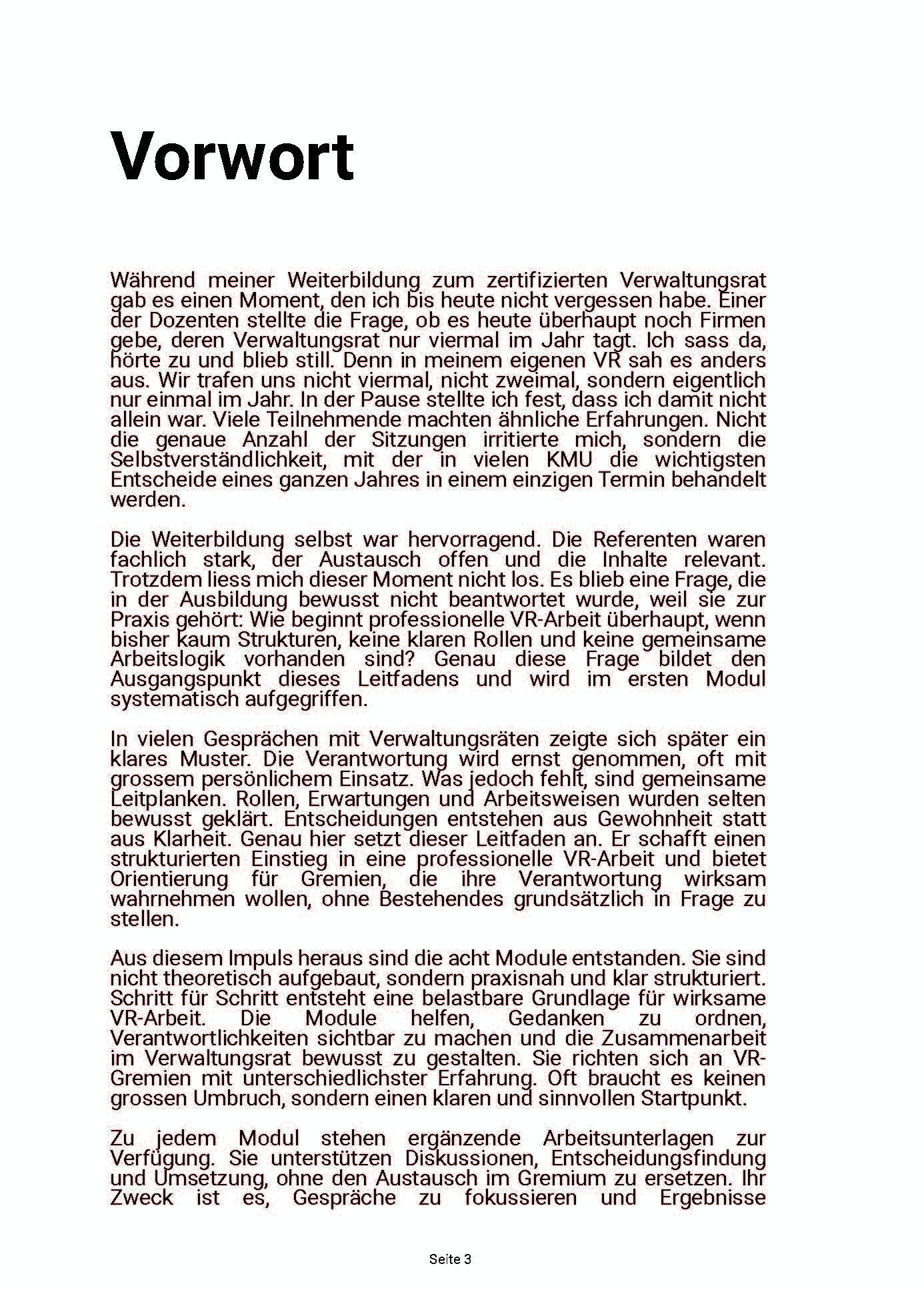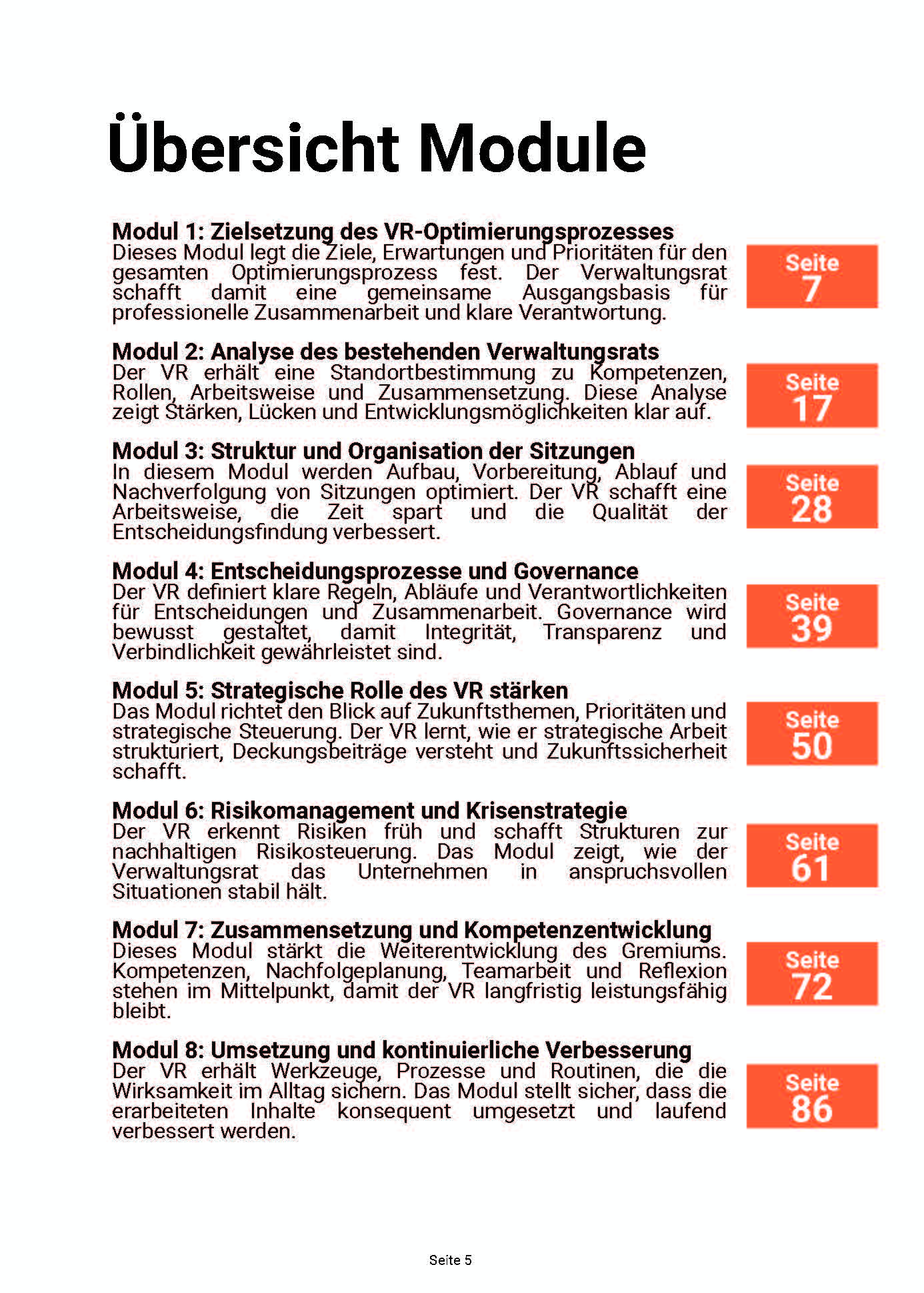 Das Buch ist ab Februar 2026 erhältlich und kann ab sofort vorbestellt werden. Es umfasst rund 100 Seiten, ist vollständig in Farbe gestaltet und bietet eine kompakte, klar strukturierte Übersicht über die acht Module. Jedes Modul enthält eine verständliche Schritt für Schritt Anleitung, eine anspruchsvolle Case Study sowie Quick Wins für die direkte Umsetzung im Alltag. Ergänzend steht ein Downloadbereich mit über 25 Vorlagen zur Verfügung, welche die praktische Anwendung im Verwaltungsratsalltag unterstützen.